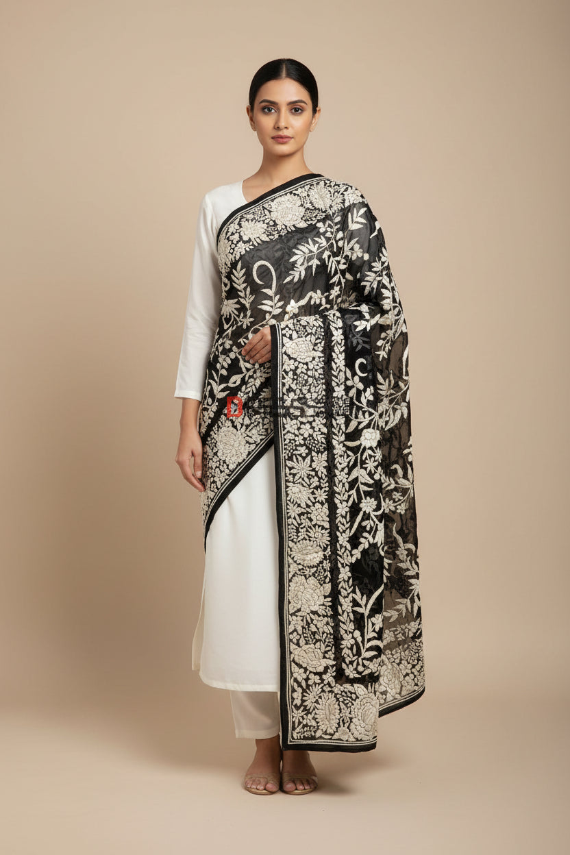 Pre Order Floral Black & Ivory Parsi Gara Dupatta