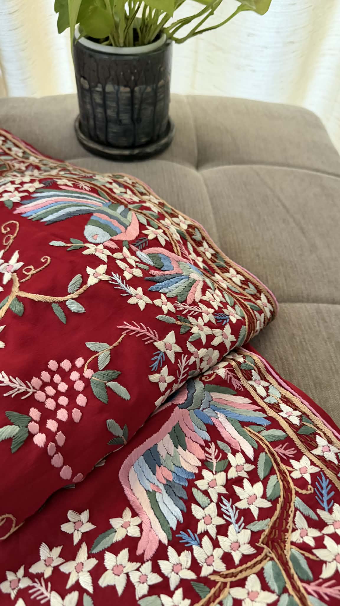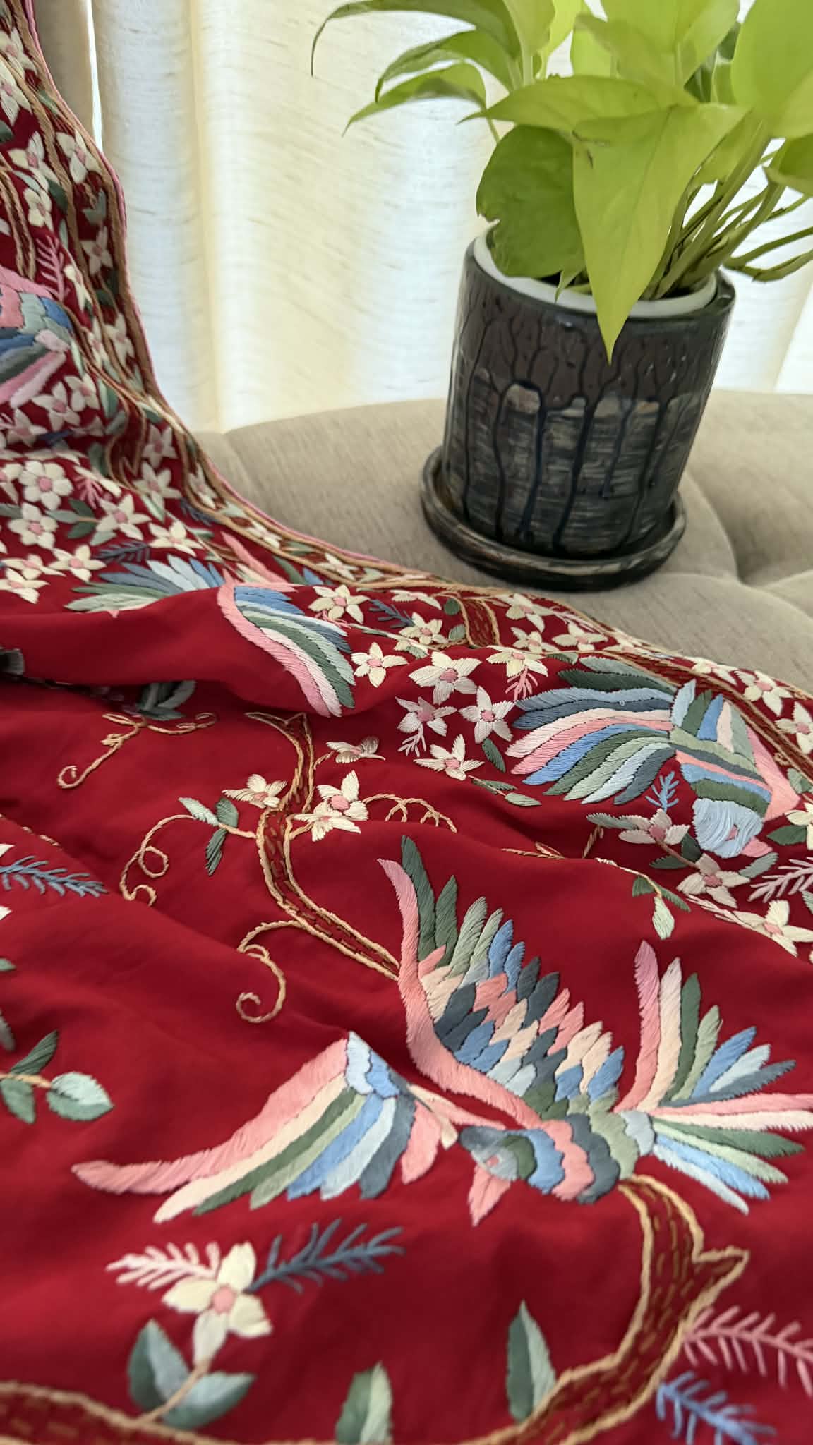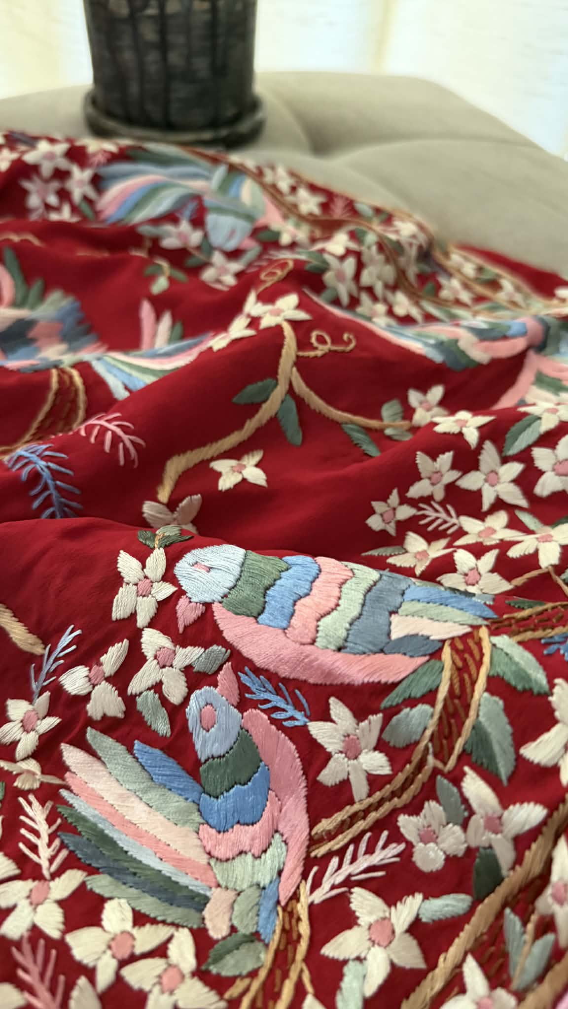 Hand Embroidered Garas on Pure georgette featuring motifs that are an amalgamation of traditional Parsi elements. They are a true testament to our commitment to the preservation and evolution of Parsi Gara embroidery. These heirloom pieces will find place in any discerning wardrobe and will stand the test of time and trends.