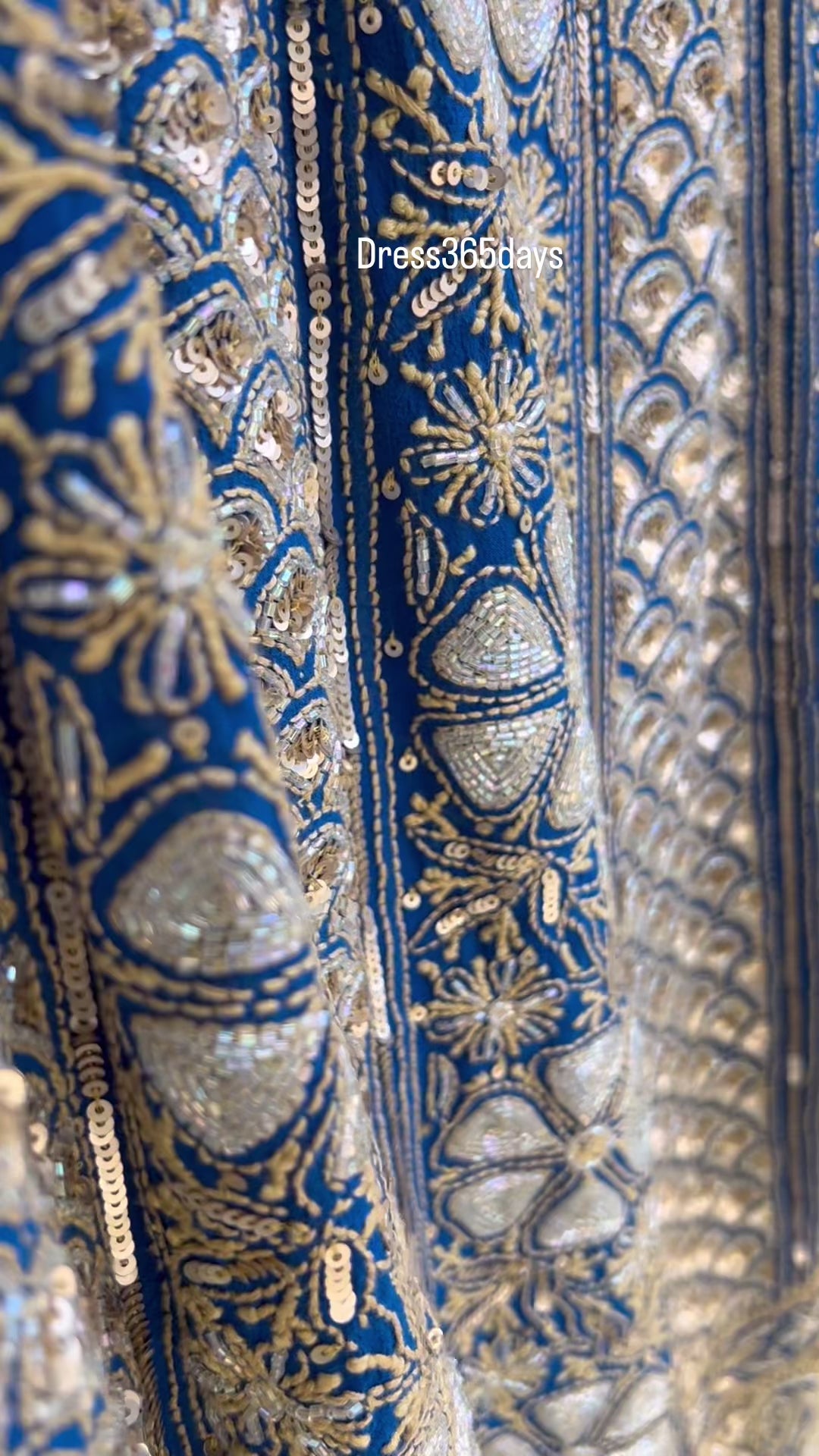 This is a royal blue two piece unstitched pure georgette chikankari kurta dupatta set with cut dana and sequin work.