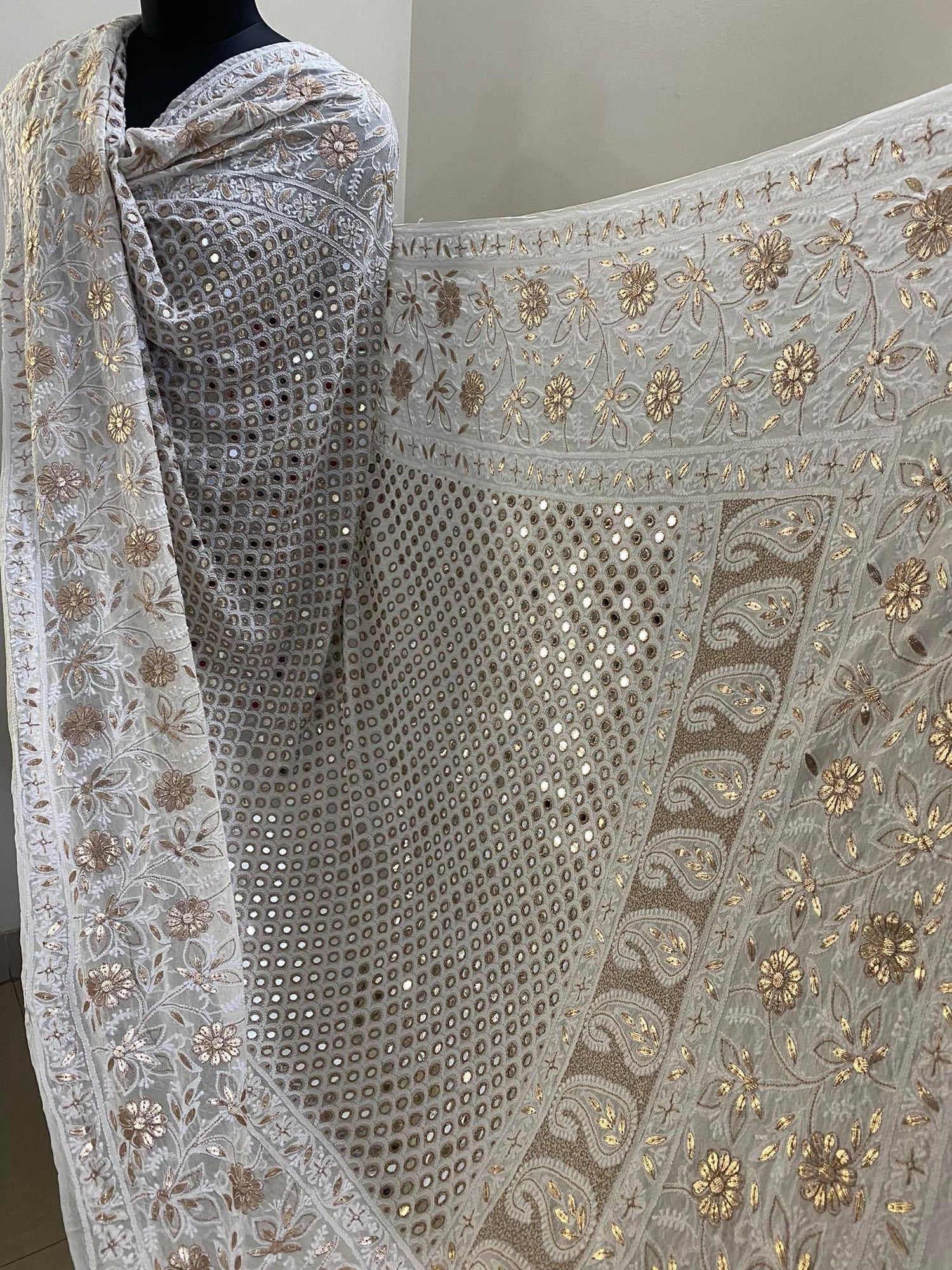 This is an ivory dupatta with hand embroidered chikankari motifs embellished with real mirror and gota patti work.